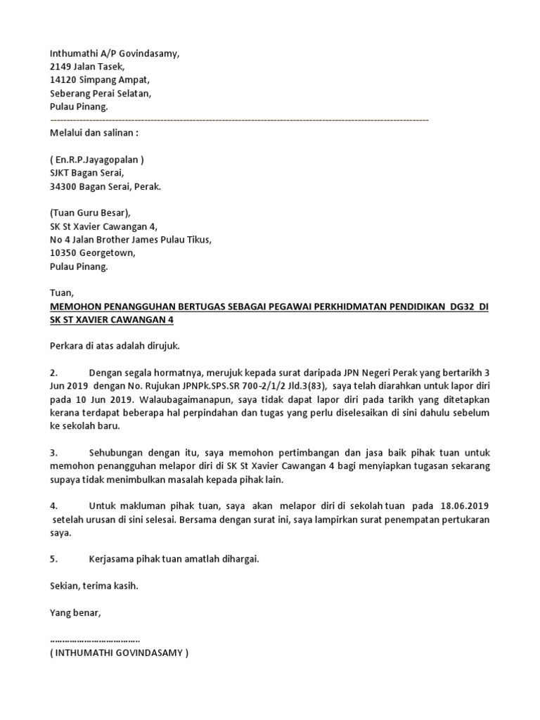 Memandangkan ada di kalangan kita yang telah berjaya dalam proses permohonan eGtukar namun memerlukan penangguhan untuk melapor diri atau memulakan tugas di sekolah baru. Telah ditangani oleh Polisi. Surat pengunduran diri adalah sebuah surat yang biasanya menjadi syarat administratif untuk memberitahukan kepada atasan maupun HRD bahwa Anda ingin berhenti dari pekerjaan.